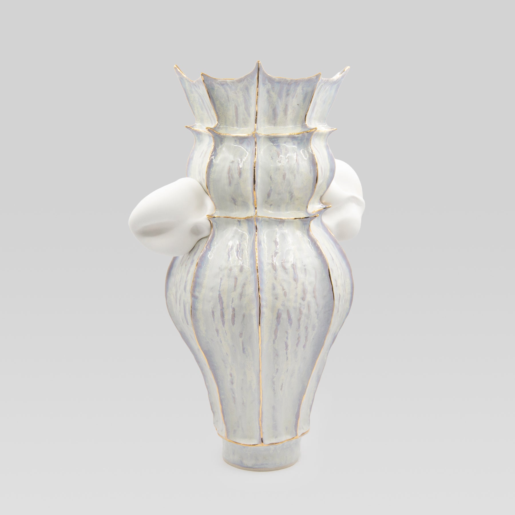 A ceramic sculpture, glazed in crystals, lined with 22k gold luster, with a plaster "cloudlike" attachment. The piece is 51cm tall and 12.6lbs. This piece is a part of my 2025 MFA application portfolio.