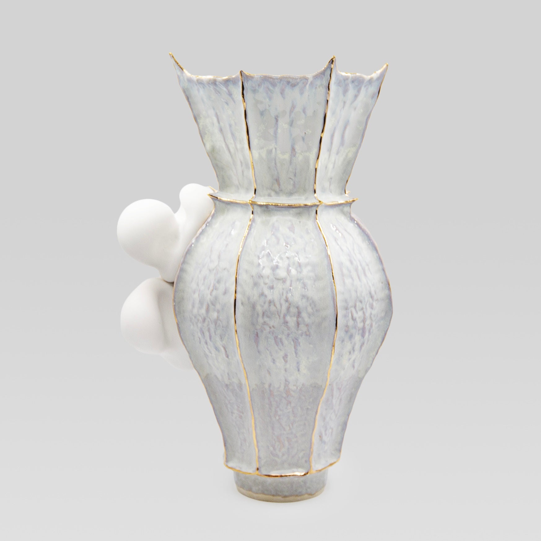 A ceramic sculpture, glazed in crystals, lined with 22k gold luster, with a plaster "cloudlike" attachment. The piece is 48cm tall and 11.4lbs. This piece is a part of my 2025 MFA application portfolio.